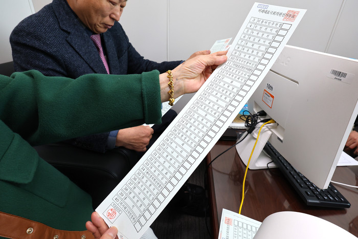 투표용지가 너무 길어 투표지분류기를 사용할 수 없다. 이번 총선 비례대표 투표용지는 100% 수개표로 진행된다. 정당 수가 늘어날 것에 대비해 선관위가 도입한 신형 용지 분류기가 34개 정당까지만 분류할 수 있기 때문이다.