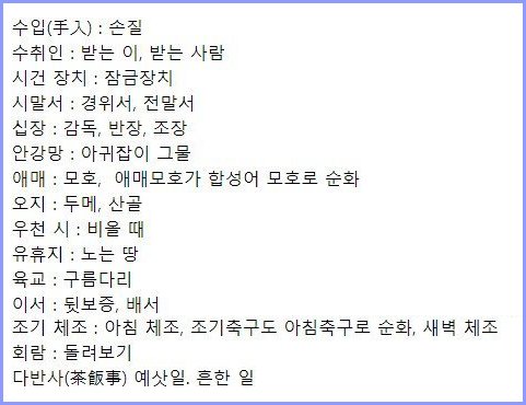 대합실(待合室), 수순(手順), 납득(納得)하다.,신품(新品) , 입장(立場. 처지), 혹성(惑星), 행성(行星), 공해(公害)