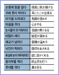 흥분의 도가니, 도토리 키재기どんぐりの背くらべ, 새빨간 거짓말, 眞赤なうそ, 애교가 넘치다, 화를 풀다, 호감을 사다, 눈살을 찌뿌리다, 의기에 불타다, 콧대를 꺾다, 무릎을 치다, 손꼽아 기다리다, 종말을 고하다, 패색이 짙다, 낙인을 찍다, 마각을 들어내다, 종지부를 찍다, 폭력을 휘두르다, 비밀이 새다, 낯가죽이 두껍다, 손에 땀을 쥐다手に汗をにぎる, 귀에 못이 박히다, 가슴에 손을 얹다, 순풍에 돛을 달다, 눈시울이 뜨거워지다, 욕심에 눈이 어두워지다, 이야기에 꽃이 피다, 고양이 목에 방울을 달다 - 猫の首に鈴を付ける