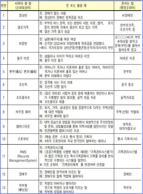 남북 관계가 경색되다, 가처분, 각서, 검침원, 계주(이어달리기), 고지서, 고참(古參), 기라성(綺羅星, 빛나는 별), 납기(納期 기한), 내역, 매립, 사물함, 생애(生涯), 선착장(船着場), 수취인(受取人), 시말서(始末書), 역할(役割), 추월(追越, 앞지르기), 밀감(귤), 선인장, 중단기선, 전신, 전선, 전보, 인력거, 상사, 사범학교, 도서관, 수학, 화학, 철학, 사상, 개화, 지구, 태평양, 요일, 의사당, 합중국, 백화점, 민주화, 반체제, 사건기자, 일조권, 잔업수당, 정보화사회, 내구소비재, 안내양, 준준결승, 방어율, 자책점, 별책, 고무, 낭만, 압력 단체(pressure), 국민총생산(G.N.P), 성화 (聖火-Olympic torch), 미시적(micro), 레저, 아프터 써비스, 마카로니 웨스턴, 포르노, 마이크, 메모, 테러, 파마