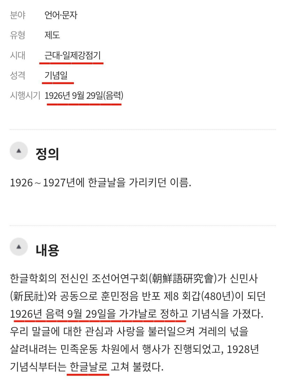 이를 기념시키기 위해 1926년 '가갸날' 로 정하고 '기념일' 로 지정