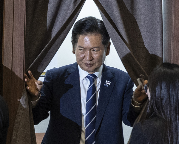 감정법 일부 개정 법률안에 대한 무제한 토론종결을 위한 기표를 마친 뒤 빠져 나오고 있다. /연합