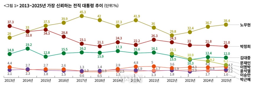 2007년 첫 신뢰도 조사 당시 가장 신뢰하는 전직 대통령이 박정희라는 응답은 52.7%였으나 올해 조사에서는 21%까지 떨어졌다. 역대 조사 중 가장 낮은 수치다. ‘전직 대통령 중 노무현을 가장 신뢰한다’는 응답은 2017년 45.3%라는 최고치를 찍은 후 등락을 겪으며 올해 38.4%를 기록했다. 2위인 박정희 전 대통령(21%)의 거의 두 배에 가깝다. 노무현 전 대통령의 경우 성별·나이·지역·직업·정치 성향·계층별로 40대 여성 61.6%, 광주·전라 49.9%, 화이트칼라 46.9%, 진보 60.7%, 상위 계층 46.5%가 그를 가장 신뢰하는 전직 대통령으로 꼽았다. 박정희 전 대통령의 경우는 70대 남성 49.5%, 대구·경북 35.7%, 농·임·어업 종사자 50.1%, 보수 42.5%, 하위 계층 26.5%가 그를 가장 신뢰하는 전직 대통령으로 꼽았다.