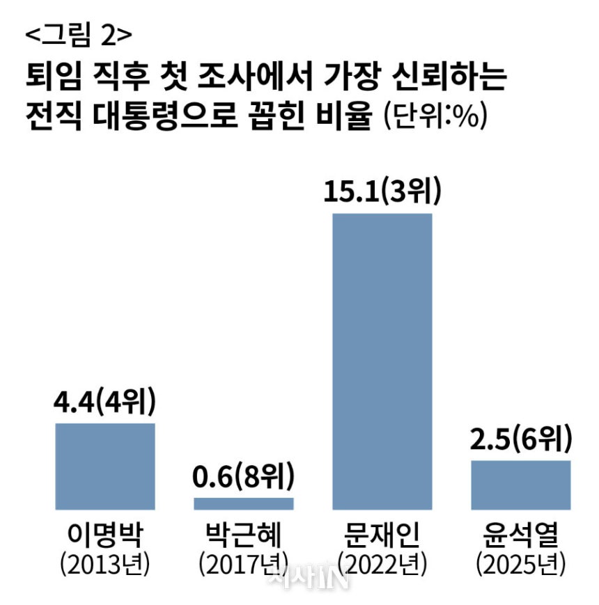 지역별로 가장 높은 윤석열 신뢰도를 보인 곳은 강원·제주(6.6%)였다. 광주·전라에서 ‘윤석열을 신뢰한다’는 응답은 0%였다. 경제적 계층으로 보면, 하위 계층 3.7%, 중위 계층 2.3%, 상위 계층 0.6%가 윤석열을 가장 신뢰하는 전직 대통령으로 꼽았다.