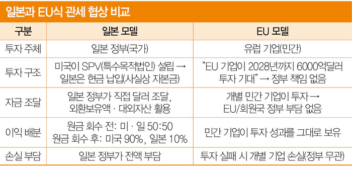 현재 미 정부는 일본이 체결한 투자 양해각서와 사실상 동일한 구조로 우리 정부를 압박 중이다. 하워드 러트닉 미 상무부 장관은 김정관 장관과 회담 하루 전인 지난 9월 11일 미 CNBC 방송에 출연해 “나는 그들(한국)이 지금 일본을 보고 있다고 생각한다. 그래서 유연함은 없다. 일본은 계약서에 서명했다”고 말해 한국에 일본과 비슷한 구조로 합의를 압박하고 있음을 시사했다.