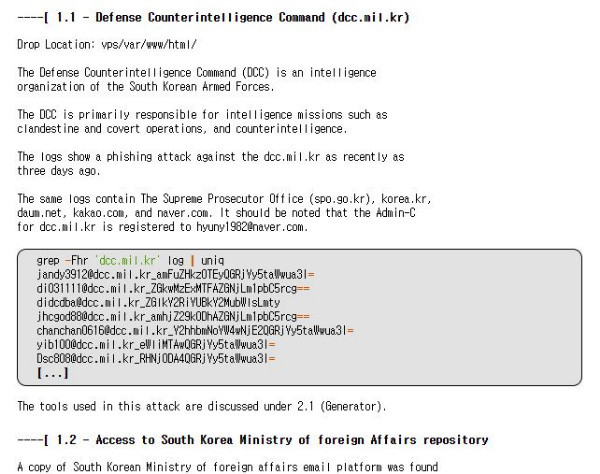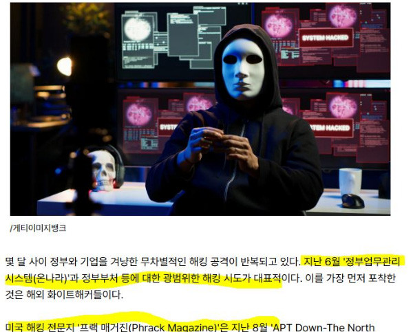 1. 미합중국 자체가 인정하고 있고 세계 정보보안 시장에서 공신력을 얻고 있는 <프랙> 이 한국 정부가 다 털렸다는 증빙자료를 첨부해 지난 여름 북괴정찰총국과 중공의 해커들에 대한 경고를 게재함 .