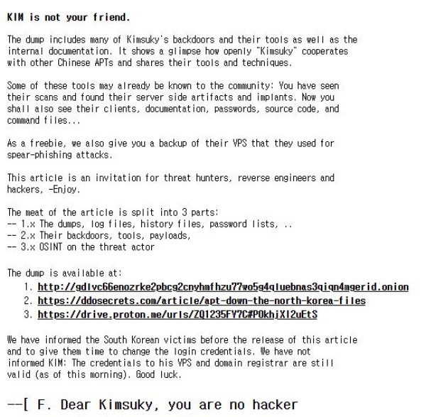 즉 KIM은 북괴의 해커부대(정찰총국 산하 수키세포로 추정)이며 이들이 중공과 연계하여 대한민국 국방외교 비문을 비롯해 이 나라 공무원들의 신분 하나하나까지 이미 다 파악하고 있음을 시사했다.