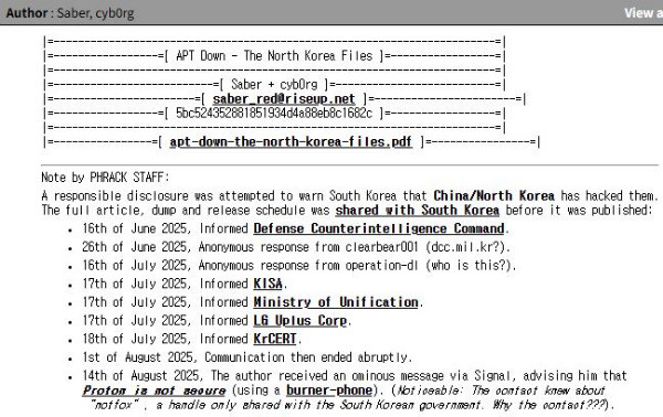 우리 방첩부대에 수없이 북괴 정찰총국의 해커들과 중공이 피싱질을 했다는 명확한 자료까지 제시했다. 또한 지금 세상에 부각된 글의 저자이자 화이트 해커 세이버 그룹은 자신들이 한국 정보당국에 이미 지난 6월 모든 정보를 제공하고 경고를 했음을 확실한 증거 통해 세계에 발설했다. 물론 세이버 그룹이 한국이 북괴와 중공에 심각한 해킹을 당했다는 사실, 즉 세칭 " 다 털려버린 사건"을 세상에 일부 드러낸 것은 지난 여름이다. 그러나 새삼 이들의 양심선언과 같은 국제보안 정보 공유건이 이 시월 세상을 뜨겁게 하는 데는 이유가 있다.