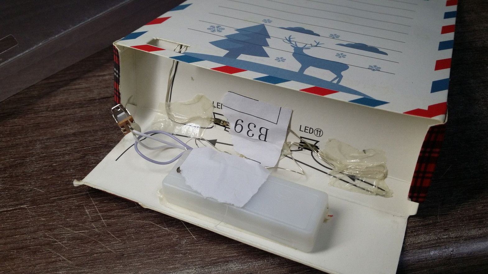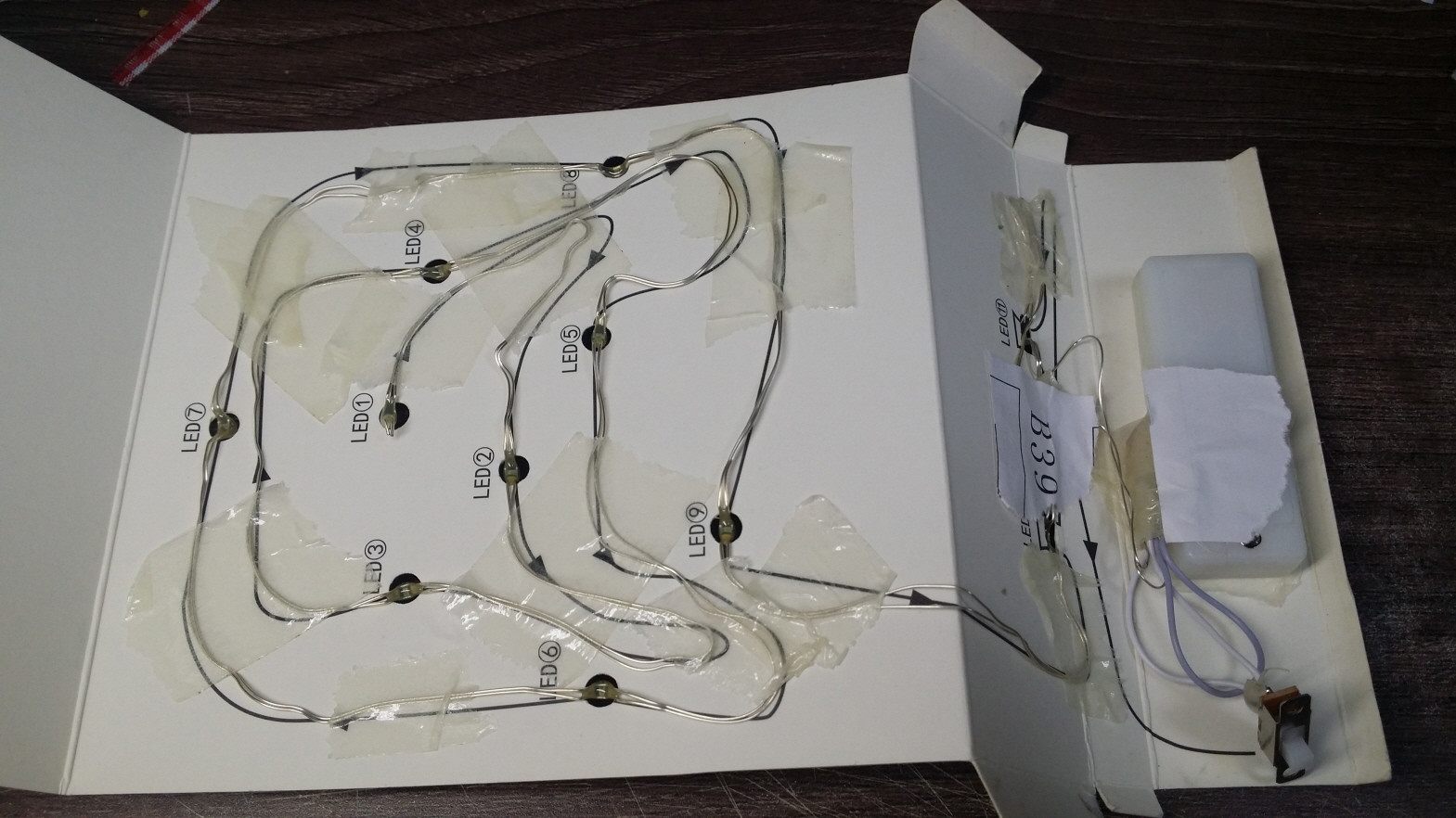 안쪽에 LED와 전선을 테잎으로 고정시킨다.