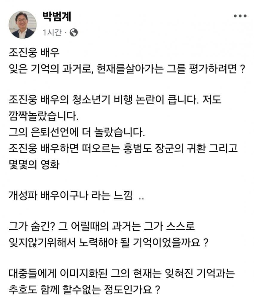 조진웅을 용서하자고 국민들(엄밀히 말해 1찍) 선동을 저렇게 하네?