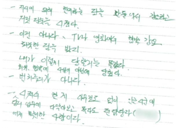 그러면서 “각본에 넘어간 것 같다. 수사관들이 목적을 이루었으니 득달같이 심문조서를 작성하고, 말도 안되는 얘기를 쓰고 도장을 찍고 사인하라고 했다. 당시 (저는) 공황장애, 심신미약상태라 잠도 못자고 멍한 상태였다. 144시간가량 심문받았다. 저 때문에 (의원님이) 피해보는 것을 원치 않다. 바보같다. 살기 싫다. 후에 심문조서 정정을 요청한다”고 적었다.