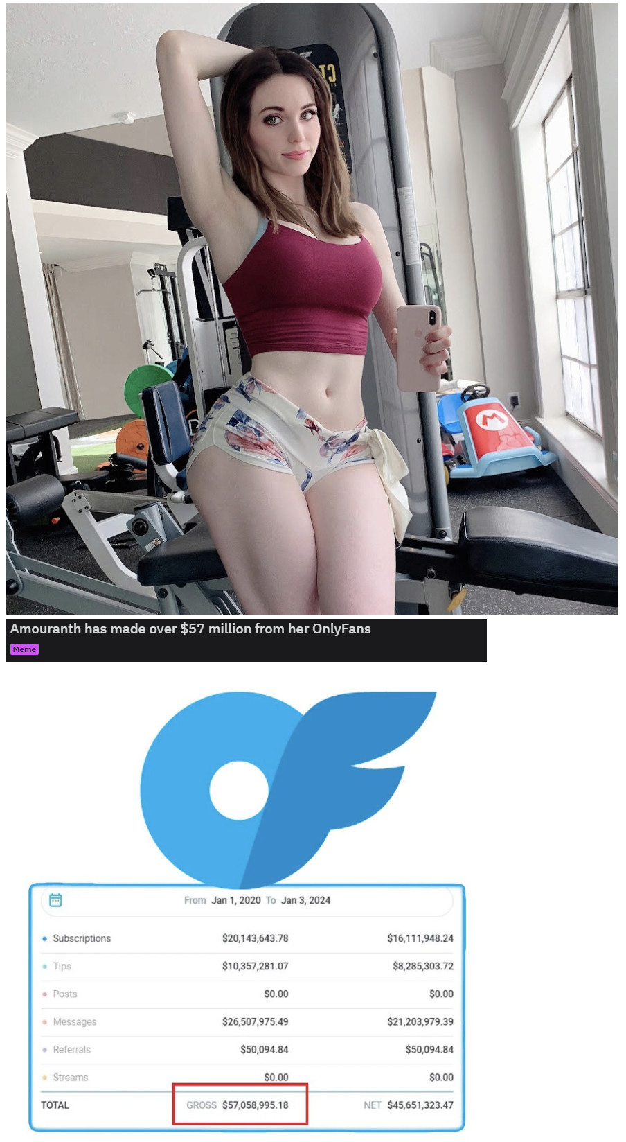 Amouranth라고 트위치에서 한동안 수익 1위찍은 BJ로 알만한 사람은 다 알꺼다. 얘 주 수입이 트위치 BJ고 사이드로 온리팬스랑 유튜브도 하는데 공식으로 잡힌 온리팬스 소득만 한화로 780억...유튜브 조회수랑 광고비 그리고 기업들이 스폰서까지 해주는거 감안하면 유튜브로도 대충 780억 정도 비슷한 소득이라고 예상되고 트위치는 더벌껄로 예상... 순자산은 2000억 이상 예상...