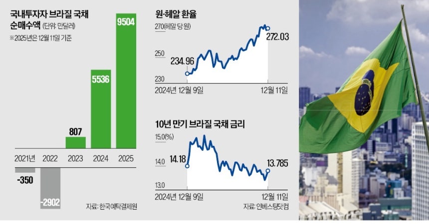 12일 한국예탁결제원에 따르면 국내 투자자들은 올해 들어 브라질 채권을 9504만달러(약 1400억원)어치 순매수했다. 브라질 채권 투자가 활발했던 2017년(2억3403만달러) 후 최대 규모다. 지난해 순매수액(5536만달러)과 비교하면 70.3% 급증했다.