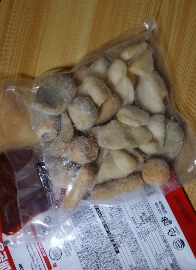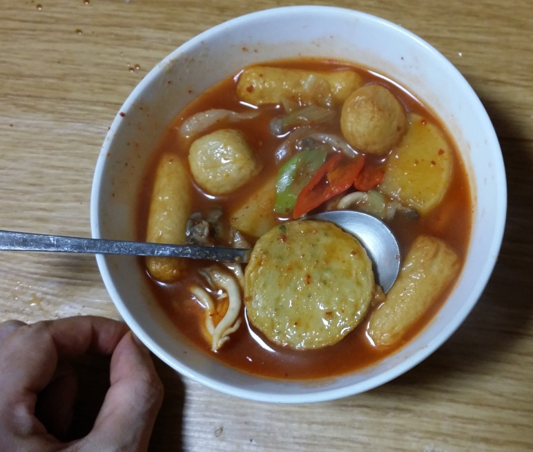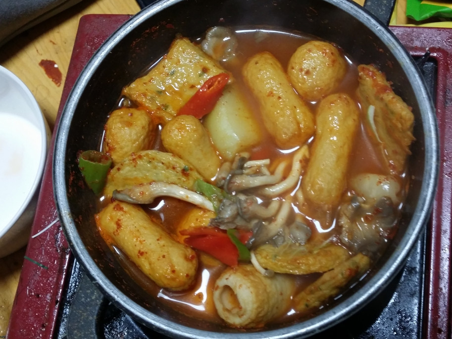 매운 소스랑 어묵, 수제비가 들어 있다.