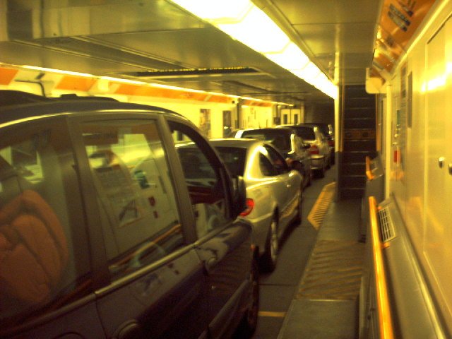자동차는 기차의 짐칸에 실린채로 운반된다.