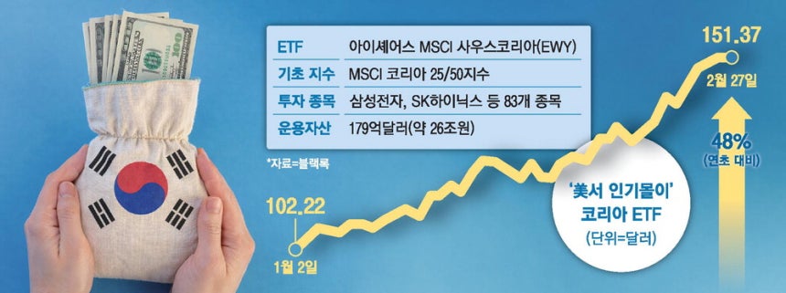 2일 금융투자 업계에 따르면 미 최대 자산운용사 블랙록이 운용하는 '아이셰어스 MSCI 사우스코리아(EWY)' ETF는 연초 대비 48% 급등하며 미 ETF 업계에서 화제의 상품으로 급부상했다. 삼성전자, SK하이닉스, 현대차, KB금융 등 한국 증시 83개 종목에 투자하는 상품이다.