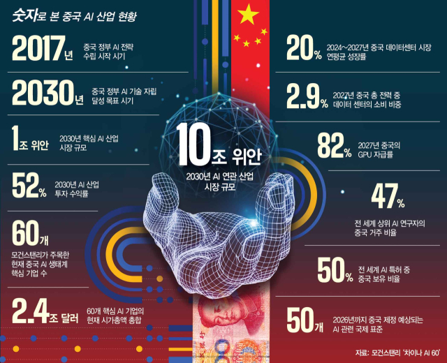 글로벌 투자은행(IB) 모건스탠리가 중국 인공지능(AI) 경쟁력의 핵심으로 주목한 것은 △데이터 △전력 공급 △반도체를 비롯한 컴퓨팅 △인재 등 4대 분야다. 2017년부터 중국 정부가 직접 나서 중장기 전략을 짜고 대대적인 투자를 단행한 결과 4대 분야에서 독보적인 글로벌 경쟁력을 확보했다는 것이다.