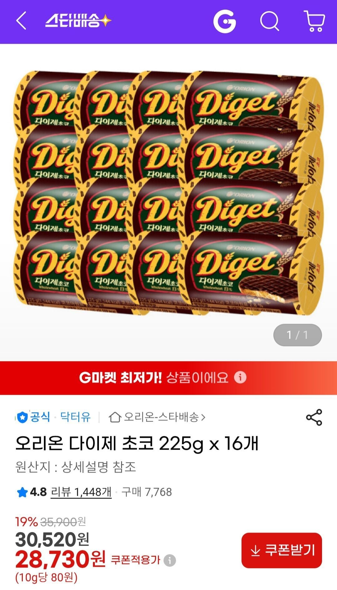 [지마켓]오리온 다이제 초코 225g x 16개