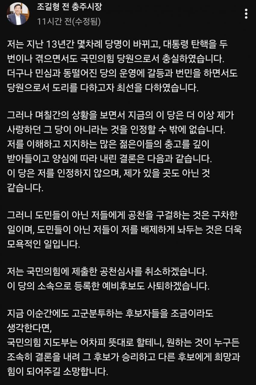 [속보] 충주맨 상전 조길형 국민의힘 탈당 선언!