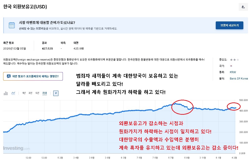 그래서 대한망국의 외환보유고는 계속 감소 중이고