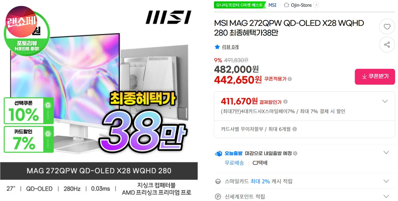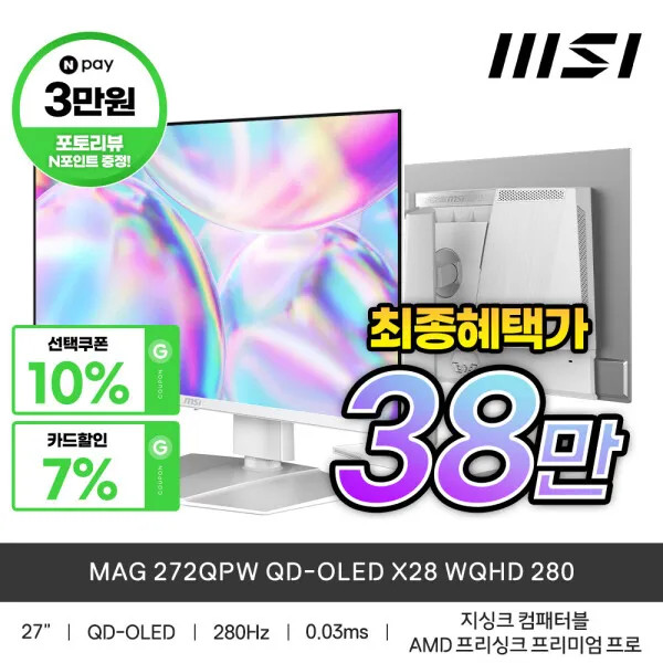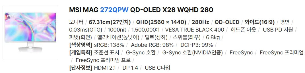 : MSI MAG 272QPW QD-OLED X28 WQHD 280Hz 체감가 35만