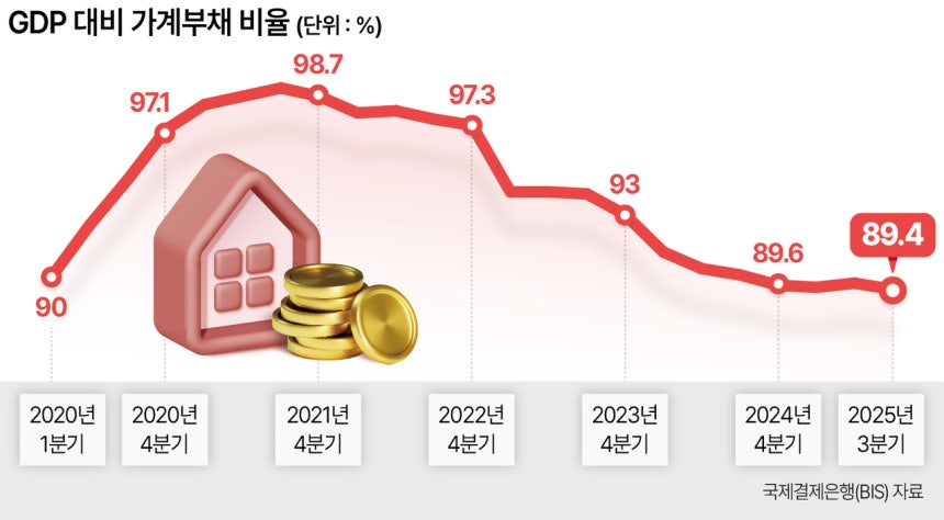 국제결제은행(BIS) 기준 가계부채 비율은 2021년 3분기 99.1%로 정점을 찍은 뒤 내림세로 돌아서 지난해 3분기 89.4%까지 내려왔다. 3년 넘게 하락 추세이지만, 영국(76%)·미국(68%)·일본(62%) 등 주요 선진국을 크게 웃도는 등 여전히 세계 최상위권이다. 한은은 이 비율이 80%를 초과하면 소비 위축으로 경제 성장이 제약된다고 분석해 왔다.