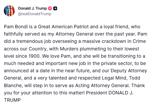 속보! 트럼프, 법무부의 무능력에 항의하며 팸 본디 해임…블랑쉬 후임으로 법무부 개혁 및 성과 제고 임무 맡아!