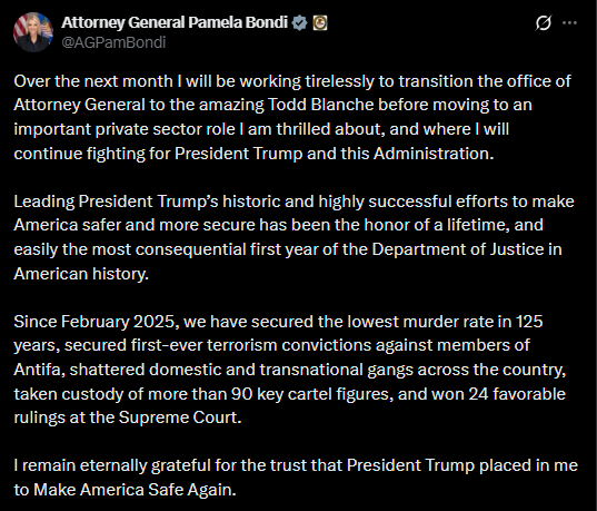팸 본디는 오늘( 2026년 4월 2일) 부로 사임했습니다 . 토드 블랜치가 오늘부로 법무부 장관직을 맡게 되었습니다. 심층 국가(Deep State)는 심각한 타격을 입었고, 법무부 장악을 위한 싸움은 현재 미국 우선주의 진영에 결정적으로 유리하게 돌아가고 있습니다 .https://gazetteller.com/operation-final-judgment-launched-u-s-military-arrests-tens-of-thousands-of-traitors-nationwide-air-force-c-17s-airlift-them-straight-to-gitmo-for-military-tribunals/embed/#?secret=CsD6CgbZI0#?secret=1GpYRhzURe