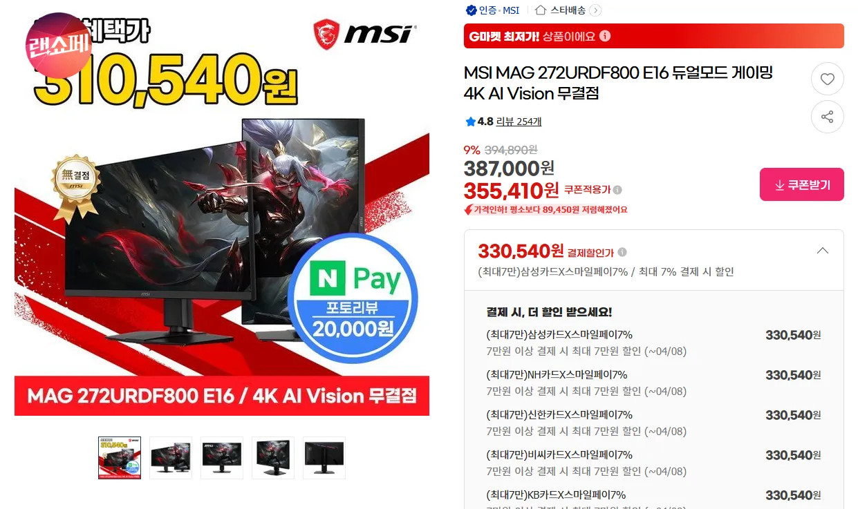 [지마켓]MSI MAG 272URDF800 E16 듀얼모드 게이밍 모니터 4K