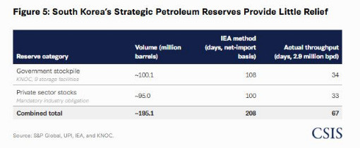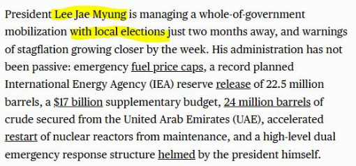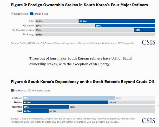한국의 성웅 박정희를 언급하지는 않았지만 기실 자원이 풍부한 미국을 비롯한 문명 여러 국가와 달리 외세에 에너지 자원을 99.999% 의존하고 있음에도 불구하고 위대한 지도자 성웅 박정희와 극진 우익 세력으로 알려진 한국의 소위 태극기 보수 세력의 원유 비축 정책으로 세계 최강의 전시 에너지 안보가 갖추어진 한국이 2026년에는 현실적으로 서류상으로만 버티고 있는 것이지 붕괴 직전이라는 의미로 요약된다. 더불어 CSIS는 지금의 한국(현재 전라도 정권)이 지방선거를 앞두고 국가 총력전으로 난장치고 있음을 이재명이라는 이름 석자를 뚜렷하게 박아 세상에 알리고 있다. 다시말해 한국의 정유 회사들이 이란 관할 해협에 얼마나 의존하고 있는지 그리고 거대 전라도 출신 기름 장사 기업에 외인 지분이 어느 정도인지를 알려 사실상 한국의 서류상 허세와 달리 서너달을 버티지 못할 것이라는 예단을 불러올 분석을 공개한 것. (이는 성웅 박정희가 완성한 자주국방의 일환인 식량안보 그리고 에너지 안보 정책 덕분에 우리 민족이 이번 페르시아 전쟁에서도 무사할 수 있었음에도 불구하고 전라도당과 전라디언들이 한국이라는 한강의 기적 국가를 망친 것을 의미한다.)