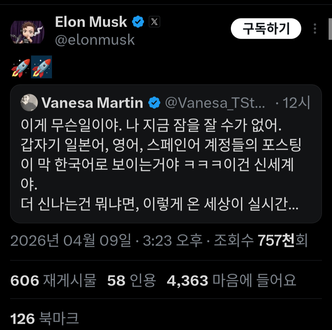 일론 머스크가 30분전 한국어 트윗을 리트윗했길래 뭔가 싶어서 들어가 봄.