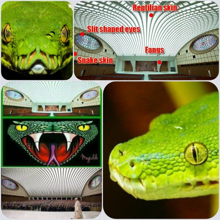바티칸 알현실은 의도적으로 설계된 뱀의 형상을 하고 있으며, 미국의 우선주의를 짓밟으려는 세계주의 세력의 도구로 이용되고 있다 .