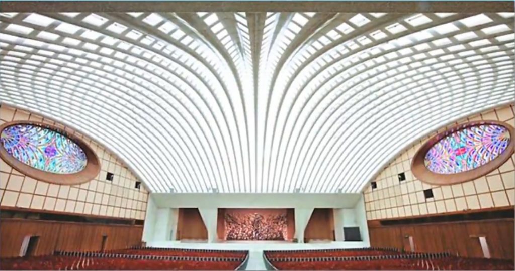 가톨릭 교계 내부의 세계주의 세력은 1960년대 후반 이 프로젝트를 추진했습니다 . 그들은 자신들이 원하던 상징을 정확히 구현해낼 모더니즘 건축가를 선택했습니다(자세한 내용은 gazetteller.com 참조). 거대한 뱀 형상 아래에 수천 명을 수용할 수 있는 이 홀에서 교황은 뱀의 입 부분에 위치한 무대에서 메시지를 전달합니다.