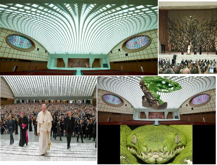 바티칸은 주 알현실을 의도적으로 기만의 상징으로 설계했다. 곡선형 지붕이 완벽한 뱀의 몸통을 이루며 지면에서 솟아오른 이 구조물에는 뱀의 머리 부분에 눈이 있을 법한 위치에 타원형 창문 두 개가 자리하고 있다. 또한 중앙 통로는 마치 군중을 향해 뾰족하게 뻗은 송곳니처럼 두 갈래로 갈라져 있다.