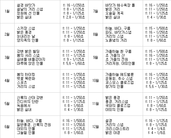 그래서 초짜를 위해 상황에 맞는 적정 노출 값을 정리해서 알려주기도 하지.