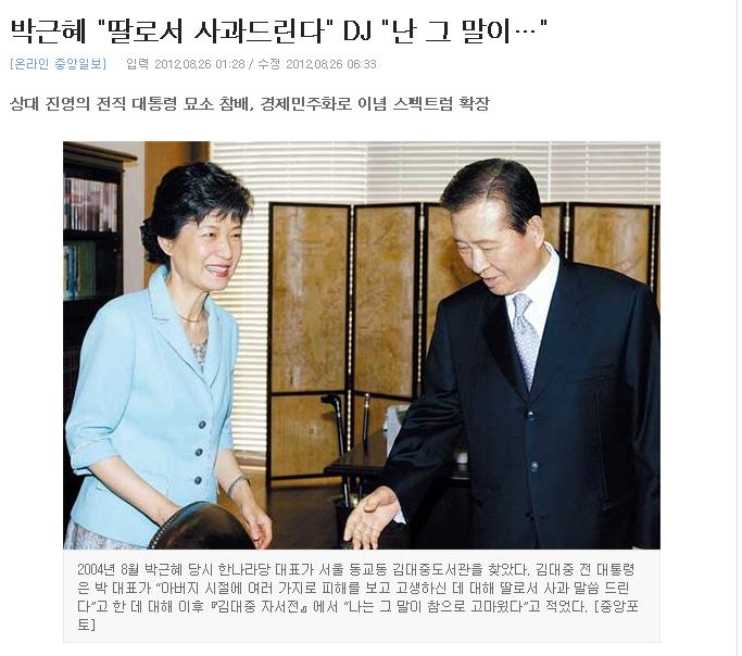 박근혜 한나라당 대표는 김대중 대통령을 찾아가 자신의 아버지 시절 여러가지로 피해를 보고 고생하신데 대해 사과드린다고 이야기했다.
