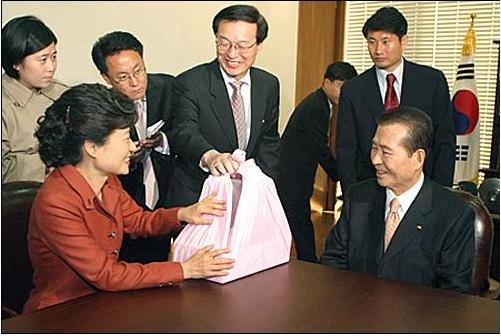 (▲ 2005-11-14,  박근혜가 김대중을 찾아가 선물 주는 장면)